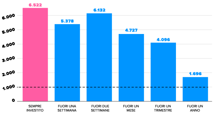 Il mercato azionario è caratterizzato da fluttuazioni regolari. Gli investitori che provano a prevedere i movimenti del mercato non solo si espongono a rischi elevati, ma spesso finiscono per rimanere fuori dal mercato troppo a lungo, perdendo occasioni di crescita.