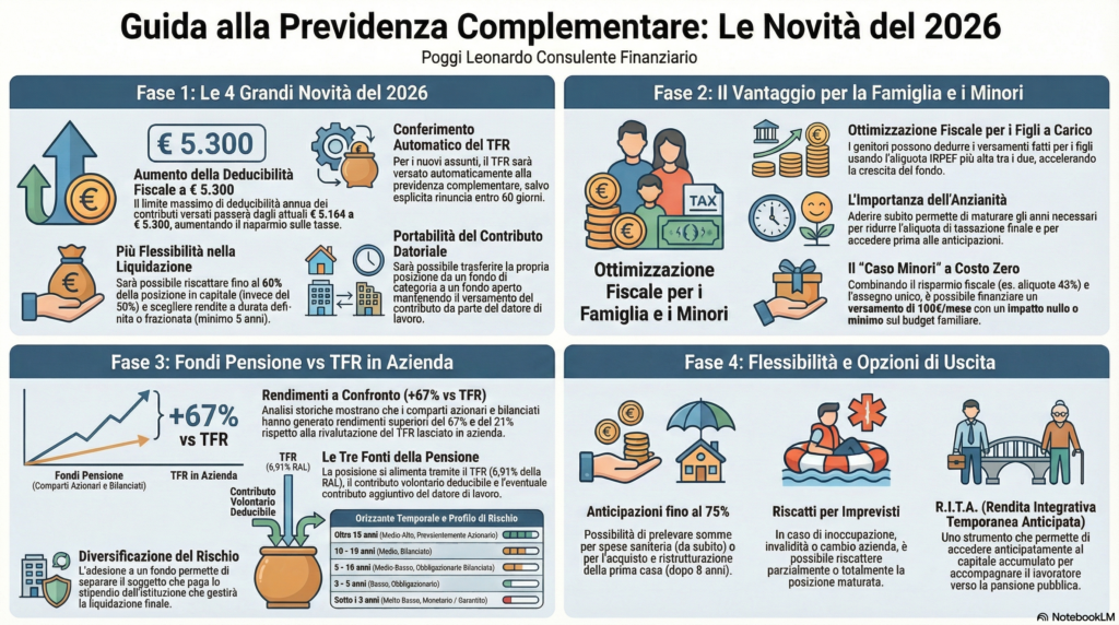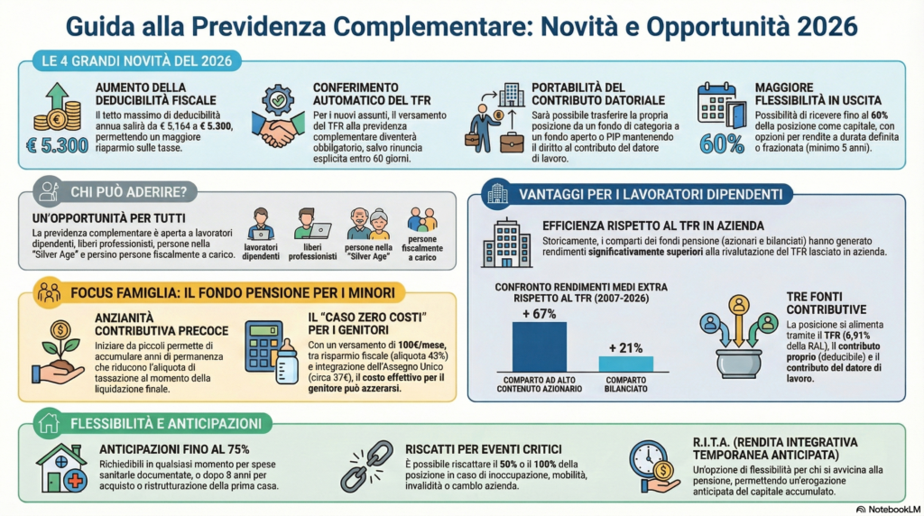La previdenza complementare nel 2026 diventa ancora più interessante perché unisce quattro elementi che raramente si trovano tutti insieme nello stesso strumento: vantaggio fiscale immediato, accumulo di lungo periodo, flessibilità crescente e forte utilità familiare oltre che individuale. Non è una soluzione uguale per tutti, ma è uno strumento che merita quasi sempre un’analisi seria, personalizzata e non superficiale.