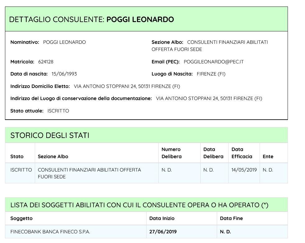 Iscrizione all’Albo Unico dei Consulenti Finanziari – Sezione dei Consulenti Finanziari abilitati all’offerta fuori sede.