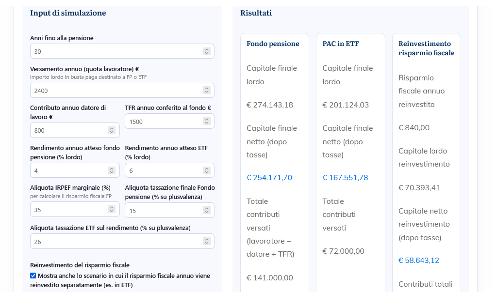 Si potrà calcolare e vedere la simulazione tra rendimento del fondo pensione, un investimento in ETF, e un investimento misto, ovvero con fondo pensione + reinvestimento del vantaggio fiscale in ETF.