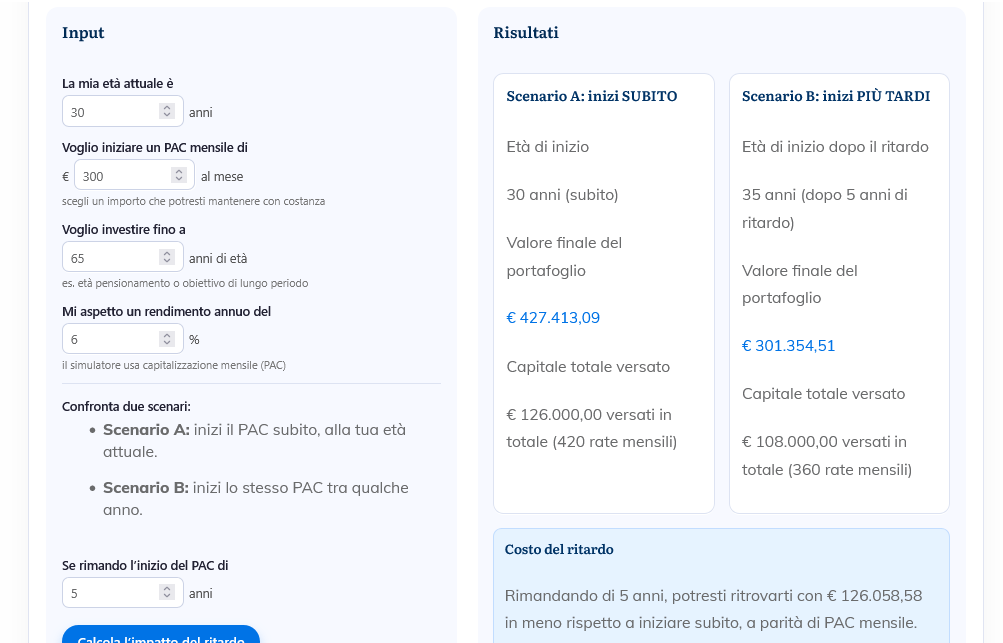 L’idea non è spaventarti, ma farti vedere in numeri quanto pesa il fattore tempo sui tuoi investimenti.